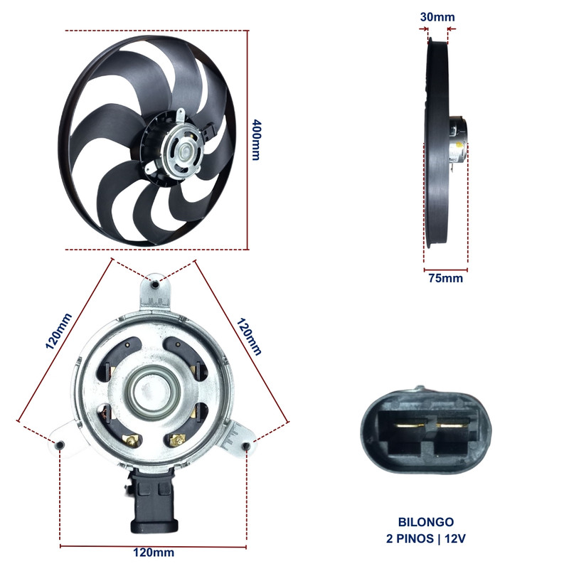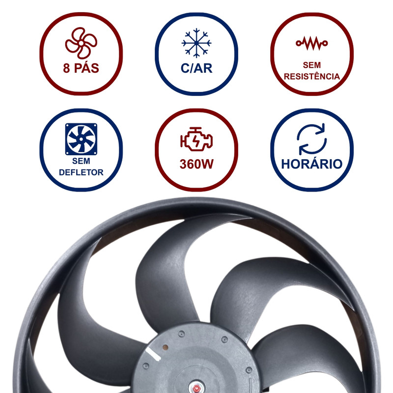 AR CONDICIONADO: SIM | PÁS: 8 | DIÂMETRO HÉLICE (MM): 403 | DIÂMETRO EIXO (MM): 8X6,5 | FORMATO EIXO: D (PJ012) | ROTAÇÃO: HORÁRIO | DIÂMETRO MOTOR (MM): 100 | TENSÃO (V): 12 | POTÊNCIA (W): 360 | DEFLETOR: NÃO | RESISTÊNCIA: NÃO | CONEXÃO: ACOPLADO | TIPO CONECTOR: BILONGO | CONECTOR: 2 PINOS