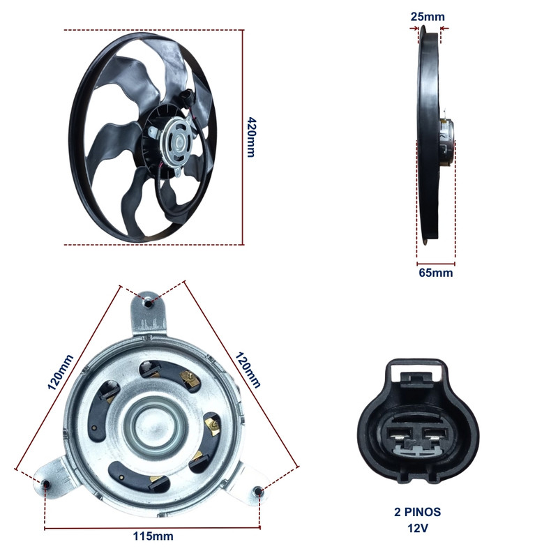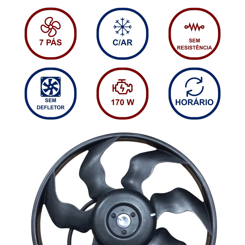 AR CONDICIONADO: SIM | PÁS: 7 | DIÂMETRO HÉLICE (MM): 420 | DIÂMETRO EIXO (MM): 8 | FORMATO EIXO: D (PJ012) | ROTAÇÃO: HORÁRIO | DIÂMETRO MOTOR (MM): 101 | TENSÃO (V): 12 | POTÊNCIA (W): 170 | DEFLETOR: NÃO | RESISTÊNCIA: NÃO | CONEXÃO: CABO | TIPO CONECTOR: OVAL | CONECTOR: 2 PINOS