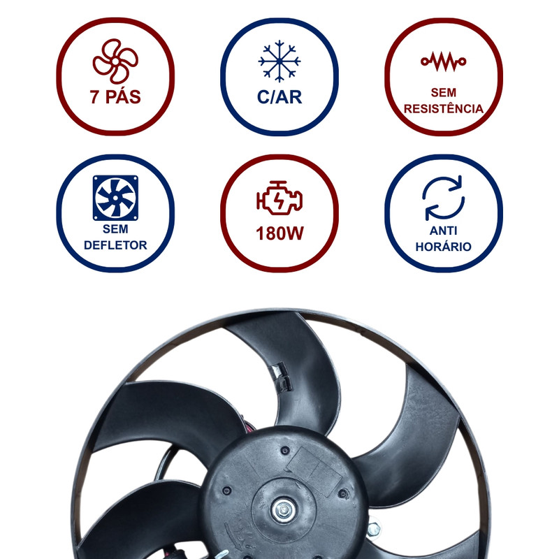 AR CONDICIONADO: 2 PINOS | PÁS: 7 | DIÂMETRO HÉLICE (MM): 295 | DIÂMETRO EIXO (MM): 8 | FORMATO EIXO: D (PJ012) | ROTAÇÃO: ANTI-HORÁRIO | DIÂMETRO MOTOR (MM): 101 | TENSÃO (V): 12 | POTÊNCIA (W): 180 | DEFLETOR: NÃO | RESISTÊNCIA: NÃO | CONEXÃO: CABO | TIPO CONECTOR: BILONGO | CONECTOR: 2 PINOS
